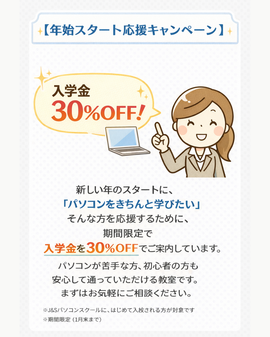 新しい年のスタートに、 「パソコンをきちんと学びたい」 そんな方を応援するために、 期間限定で 入学金を30%OFFを実施いたします。 パソコンが苦手な方、初心者の方も 安心して通っていただける教室です。 まずはお気軽にご相談ください。 ※ J&Sパソコンスクールに、はじめて入校される方が対象です ※期間限定 2026/1/31迄 無料カウンセリングはこちら |